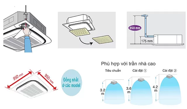 Với cải tiến mới, điều hòa âm trần Daikin có độ dày chỉ 256mm, dễ dàng lắp đặt cho trần hẹp, bị hạn chế bởi cốt trần. Không chỉ thế, mỗi góc máy đều có vít điều chỉnh giúp cho việc thay đổi độ cao của máy trở nên dễ dàng hơn mà không cần đến các lỗ thăm trần hay phải cắt trần mỗi khi điều chỉnh. Khối lượng máy cũng khá nhẹ, vì thế không cần đến các thiết bị hỗ trợ nâng máy. Hướng lưới hút bụi cũng có thể xoay hướng nhằm tạo sự đồng bộ trong không gian khi mà lắp nhiều máy. Đây là điều vô cùng hợp lý để quá trình thi công trở nên thuận lợi hơn